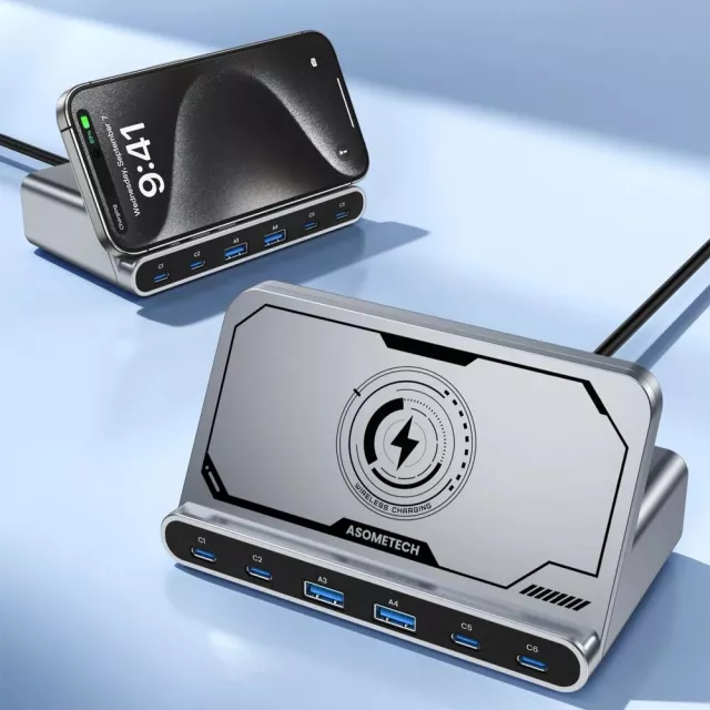 Stop juggling chargers and outlets. This high-power 160W desktop charging station is designed to handle all your devices at once, without slowing down. It features a smart mix of USB-C and USB-A ports plus a built-in wireless charging pad, so your phone, laptop, tablet, earbuds, and accessories can all charge at the same time. Fast, stable, and easy to use, it keeps your desk clean and your tech ready to go.
