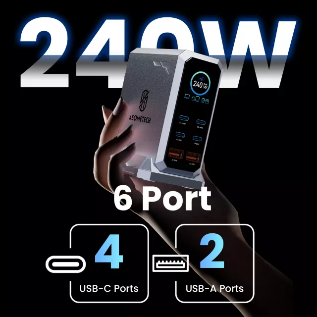 Meet your all-in-one charging upgrade. This 240W GaN fast charging station is built to replace the clutter of multiple adapters and slow plugs. With 6 ports and a smart digital display, it powers your phone, laptop, tablet, earbuds, and more from a single compact station — faster, safer, and more efficiently than standard chargers.
