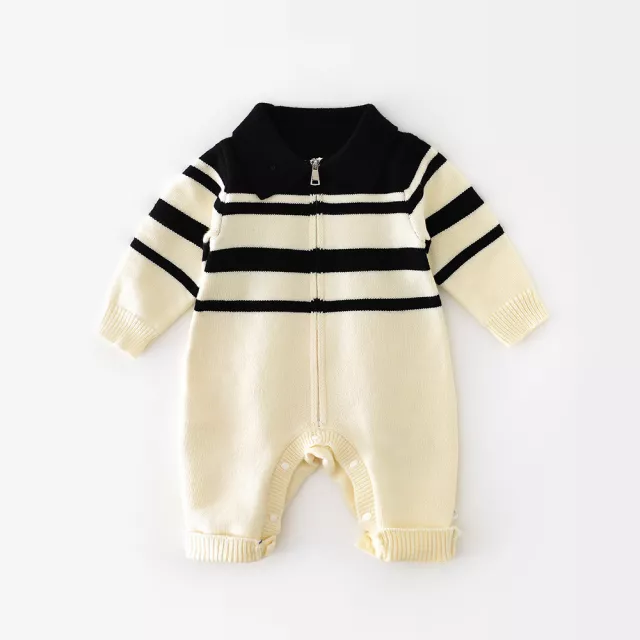 Baby Striped Knit Romper with Collar and Full-Zip Front