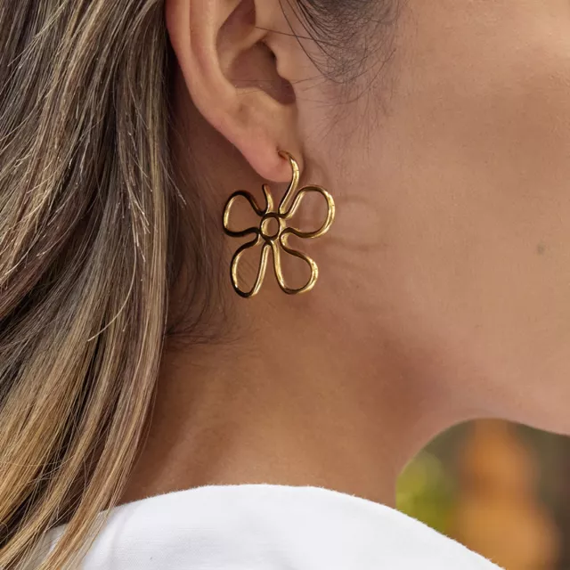 These earrings are made from high-quality stainless steel, known for its strength and resistance to tarnishing. The smooth 18K gold plating brings a warm, radiant glow that complements every skin tone. The classic push-back closure ensures a secure and comfortable fit. Measuring just under 1 in., they provide the ideal size for an elegant yet eye-catching look. Whether you’re dressing up for a party or adding a touch of style to your everyday outfit, these floral studs are designed to fit every moment.