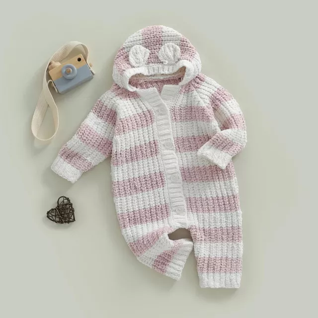 Wrap your baby girl in warmth and charm with this adorable knit hooded romper. Made from a soft blend of acrylic fiber and polyester, this long-sleeve jumpsuit is designed to keep your little one comfortable and cozy all day long. The striped print adds a touch of playful style, while the button-down front makes dressing and diaper changes quick and easy. Perfect for lounging, playtime, or snuggling, this romper combines everyday practicality with irresistible cuteness.