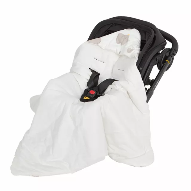 Sized at approximately 35.4 × 35.4 in, this blanket provides full coverage without bulk. The 2.5 tog thickness makes it ideal for winter use while remaining breathable and gentle against delicate skin. Its fixed 5-hole design allows it to fit securely into most infant car seats and newborn baskets, keeping the blanket perfectly in place while you’re on the move. The charming grey elephant pattern adds a sweet, comforting touch your baby will adore.