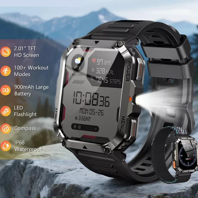 Step into every adventure with confidence. This powerful outdoor smartwatch is designed for people who love movement, exploration, and reliability. With a bold 2.01-inch TFT HD screen, a durable build, and a high-capacity 900 mAh battery, it keeps you connected and aware no matter where the day takes you. Whether you’re hiking, training, working, or simply staying active, this smartwatch gives you the essential tools you need — right on your wrist.