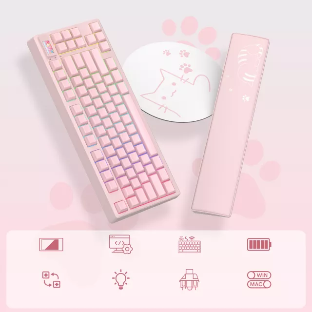 Step into a world where performance meets personality. This pink wireless gaming keyboard is designed for players and creators who want smooth mechanics, vibrant lighting, and a touch of flair on their desk. With its smart OLED display, ergonomic tilt, and soft gasket-mounted feel, this compact 75% keyboard is built to elevate your setup whether you’re working, gaming, or multitasking across devices.