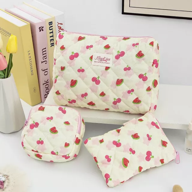 Bring a touch of sweetness to your daily routine with this charming quilted makeup bag featuring a playful watermelon and cherry pattern. Designed with a clean, fresh look and crafted from durable polyester, this small cosmetic case keeps your beauty essentials organized whether you’re at home or on the go. Its lightweight build and soft quilted texture make it comfortable to carry, while its compact size fits easily into handbags, backpacks, or travel totes.