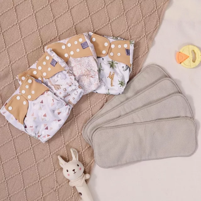 Give your baby long-lasting comfort with these 4 pcs waterproof reusable cloth diapers, designed to fit babies from 6 to 33 lbs. Made for everyday use, these nappies offer a gentle, breathable feel while keeping leaks under control—perfect for naps, playtime, and overnight. Each diaper includes an adjustable pocket design and comes with four soft inner inserts for reliable absorbency.
